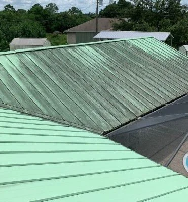 • Close-up of a roof with light green metal panels and a corrugated metal roof in the background, surrounded by trees and other buildings.